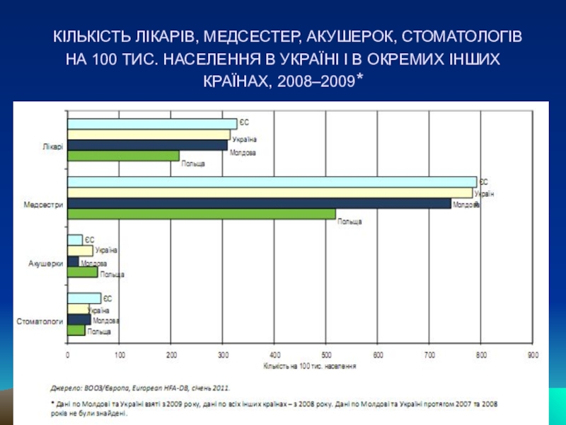 Слайд 39 КІЛЬКІСТЬ ЛІКАРІВ, МЕДСЕСТЕР, АКУШЕРОК, СТОМАТОЛОГІВ НА 100 ТИС. НАСЕЛЕННЯ