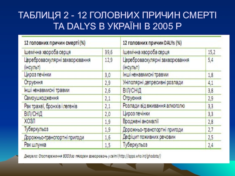 Слайд 33ТАБЛИЦЯ 2 - 12 ГОЛОВНИХ ПРИЧИН СМЕРТІ ТА DALYS В