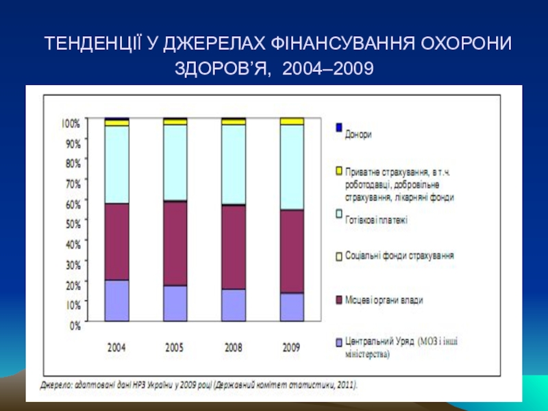 Слайд 38 ТЕНДЕНЦІЇ У ДЖЕРЕЛАХ ФІНАНСУВАННЯ ОХОРОНИ ЗДОРОВ’Я, 2004–2009
