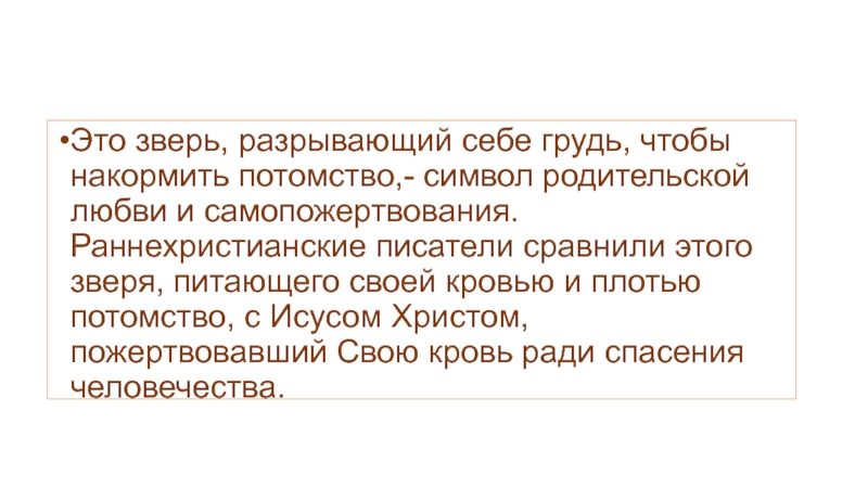 Слайд 9Это зверь, разрывающий себе грудь, чтобы накормить потомство,- символ родительской