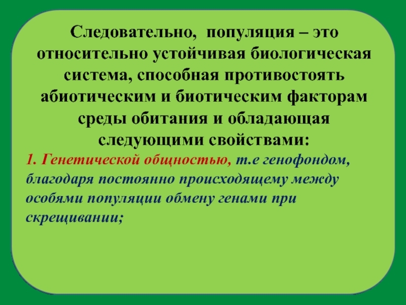 Слайд 7Следовательно, популяция – это относительно устойчивая биологическая система, способная противостоять