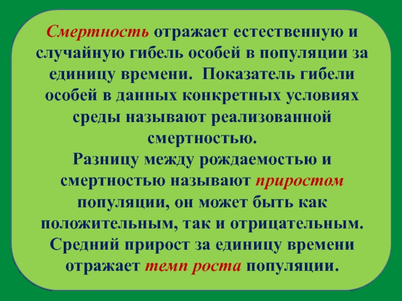 Слайд 13Смертность отражает естественную и случайную гибель особей в популяции за