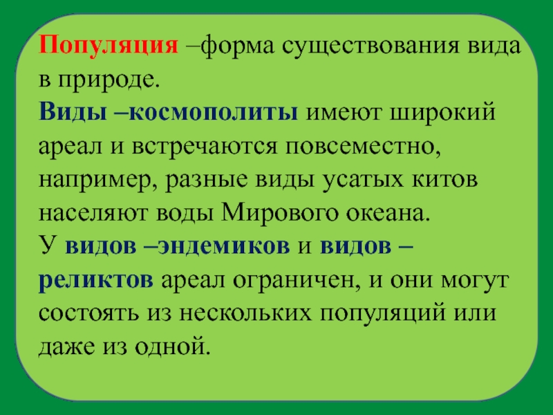 У видов –эндемиков и видов – реликтов ареал ограничен, и они могут состоять из нескольких популяций или даже из одной.