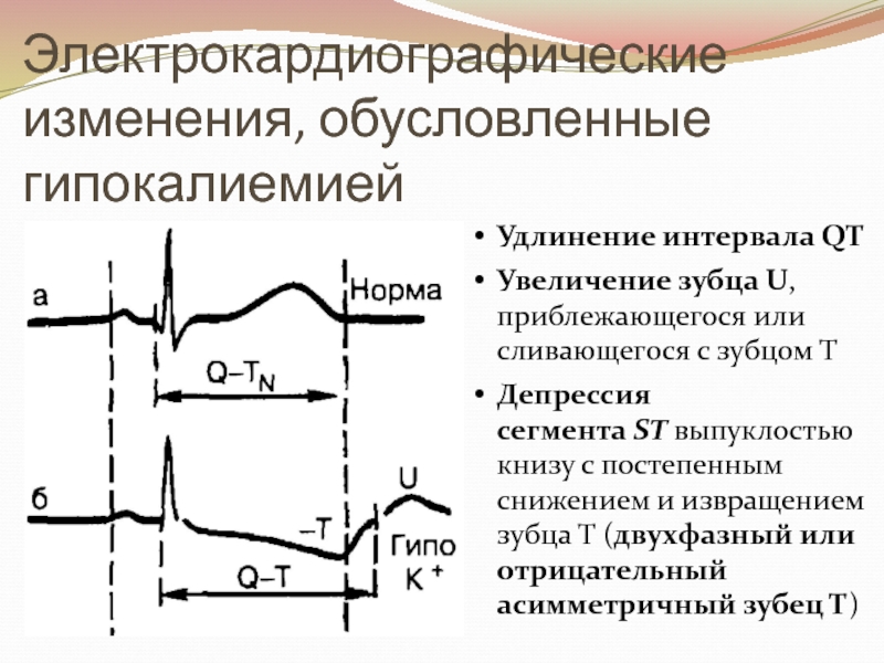 Слайд 13Электрокардиографические изменения, обусловленные гипокалиемией