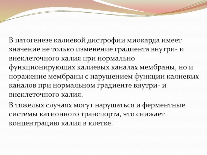 Слайд 7В патогенезе калиевой дистрофии миокарда имеет значение не только изменение