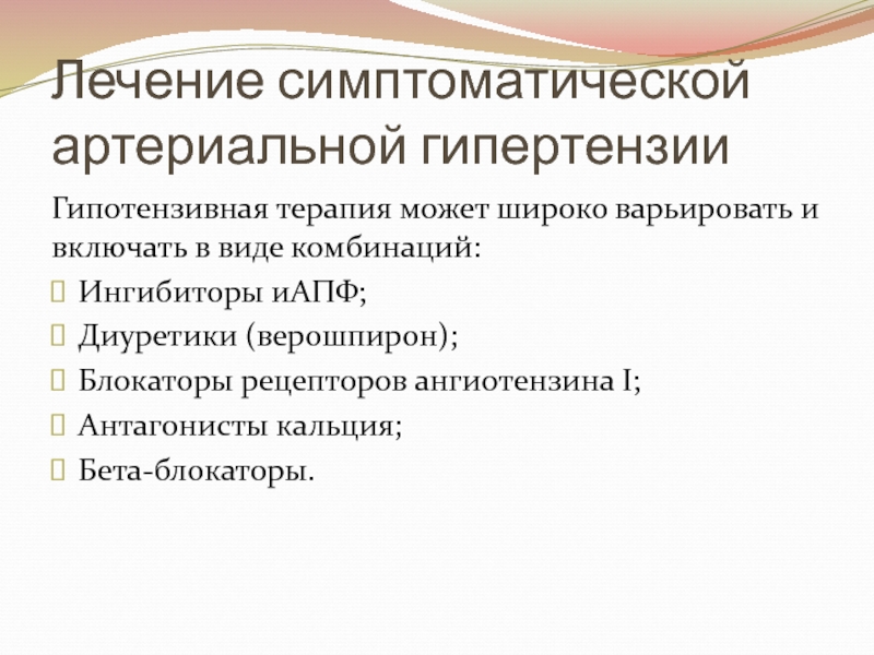 Слайд 17Лечение симптоматической артериальной гипертензии