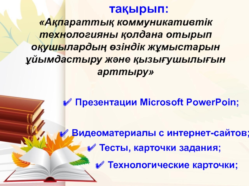 тақырып: Презентации Microsoft PowerPoin; «Ақпараттық коммуникативтік технологияны қолдана отырып оқушылардың өзіндік жұмыстарын ұйымдастыру және қызығушылығын арттыру»Видеоматериалы с