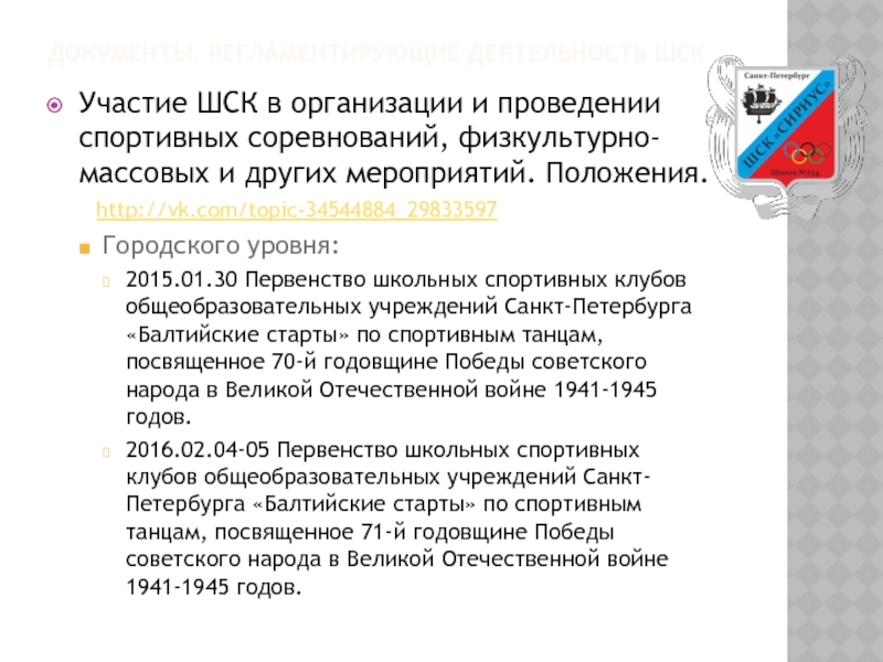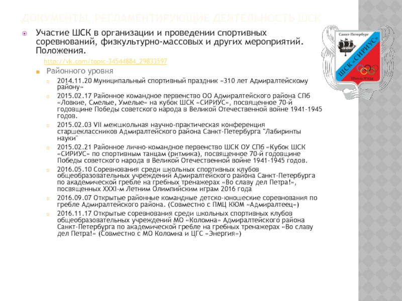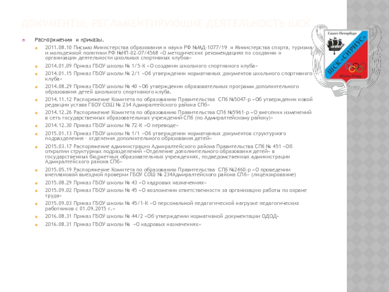 Слайд 4Документы, регламентирующие деятельность ШСК