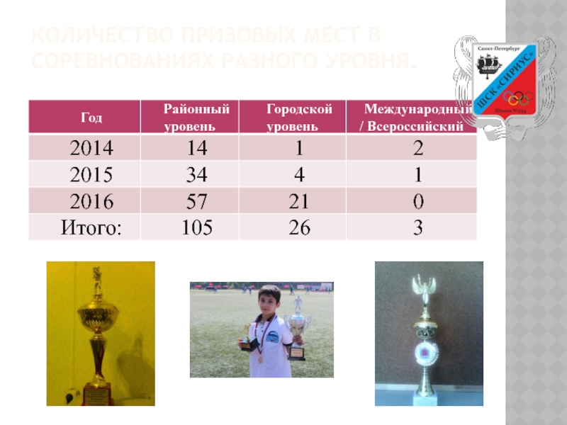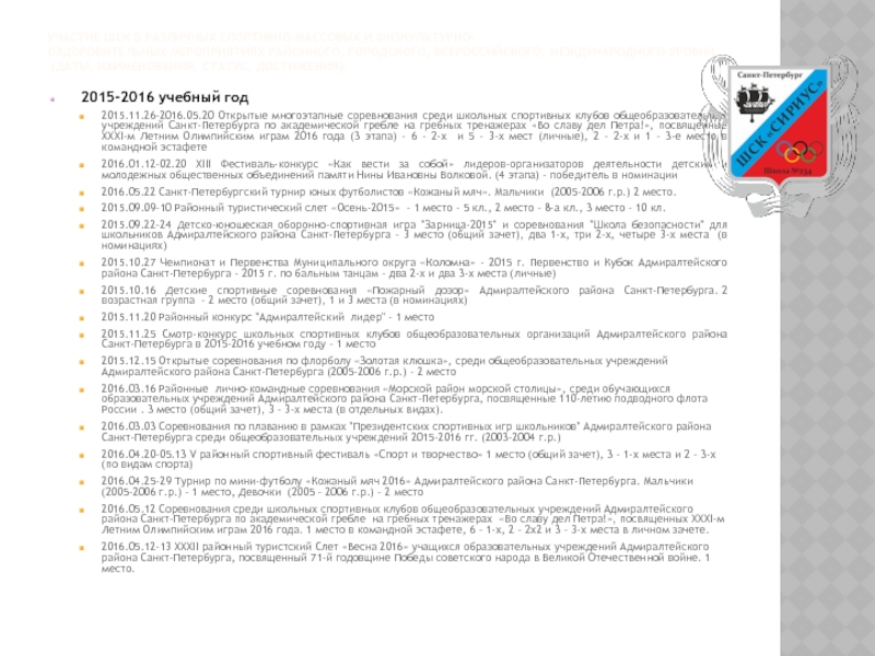 2016.05.12 Соревнования среди школьных спортивных клубов общеобразовательных учреждений Адмиралтейского района Санкт-Петербурга по академической гребле на гребных тренажерах «Во славу дел Петра!», посвященных ХХХI-м Летним Олимпийским играм 2016 года. 1 место в командной эстафете, 6 – 1-х, 2 – 2х2 и 3 – 3-х места в личном зачете.