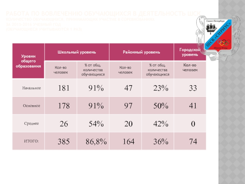 Слайд 7Работа по вовлечению обучающихся в деятельность ШСК