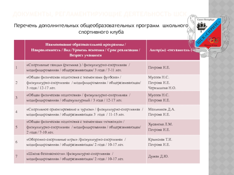 Перечень дополнительных общеобразовательных программ школьного спортивного клуба