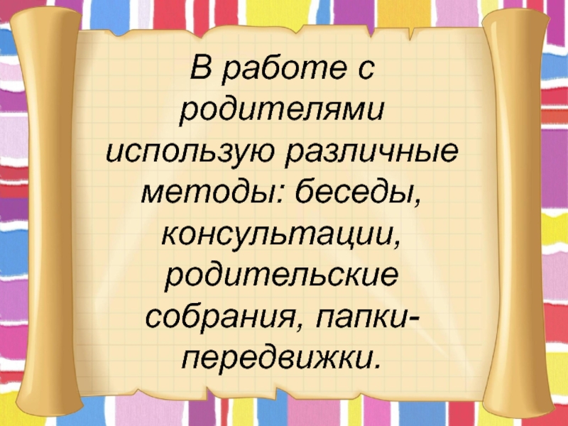 Слайд 11В работе с родителями использую различные методы: беседы, консультации,