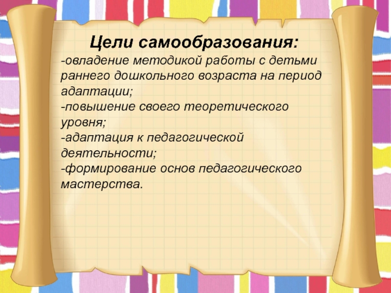 Цели самообразования:-овладение методикой работы с детьми раннего дошкольного возраста на период адаптации;-повышение своего теоретического уровня;-адаптация к педагогической