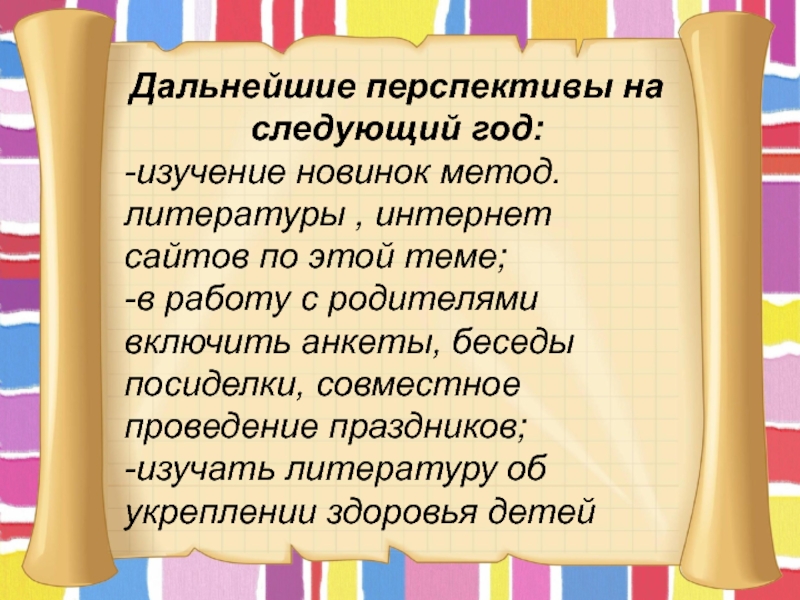 Дальнейшие перспективы на следующий год:-изучение новинок метод. литературы , интернет сайтов по этой теме;-в работу с родителями