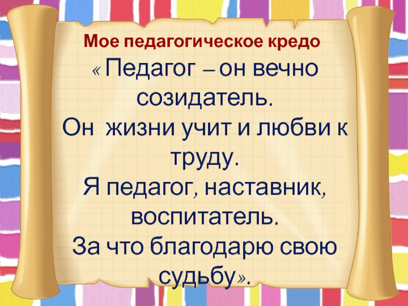 Мое педагогическое кредо      « Педагог – он вечно созидатель.Он жизни учит и любви к труду.Я педагог, наставник, воспитатель.За