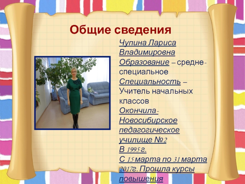 Общие сведенияЧупина Лариса ВладимировнаОбразование – средне-специальноеСпециальность – Учитель начальных классовОкончила- Новосибирское педагогическое училище №2В 1995 г.С 15 марта по 31 марта 2017г. Прошла курсы повышения квалификации и переподгатовки работников образования.