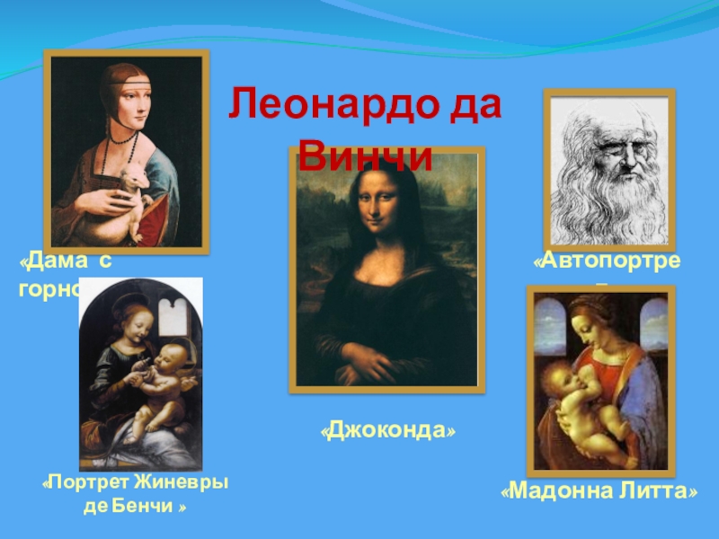 «Дама с горностаем»Леонардо да Винчи«Мадонна Литта» «Автопортрет»«Джоконда»«Портрет Жиневры де Бенчи »