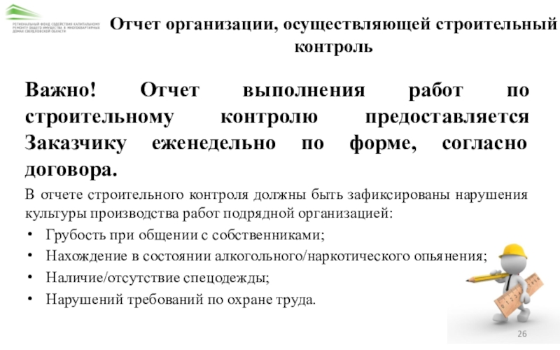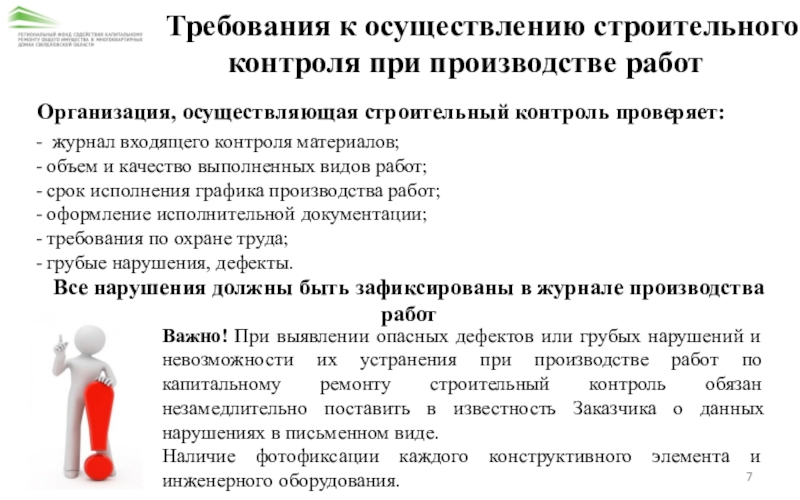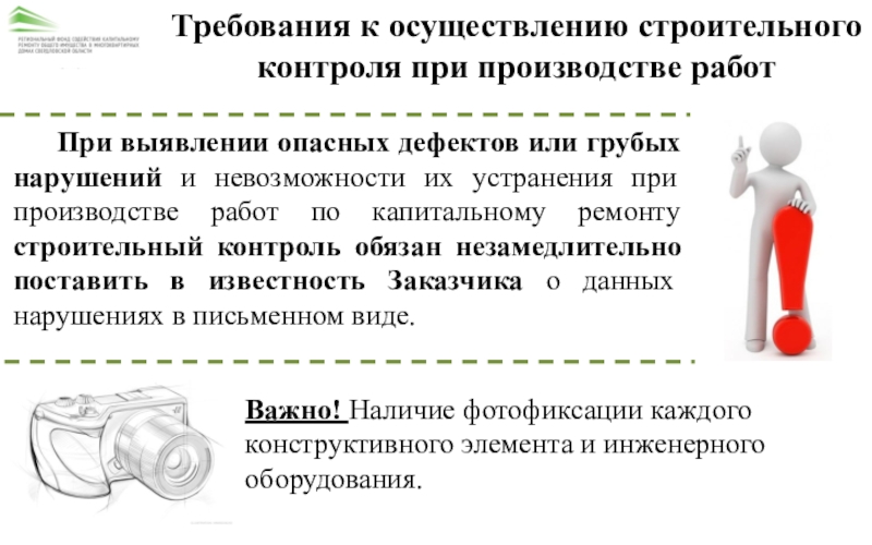 Важно! При выявлении опасных дефектов или грубых нарушений и невозможности их устранения при производстве работ по капитальному ремонту строительный контроль обязан незамедлительно поставить в известность Заказчика о данных нарушениях в письменном виде.