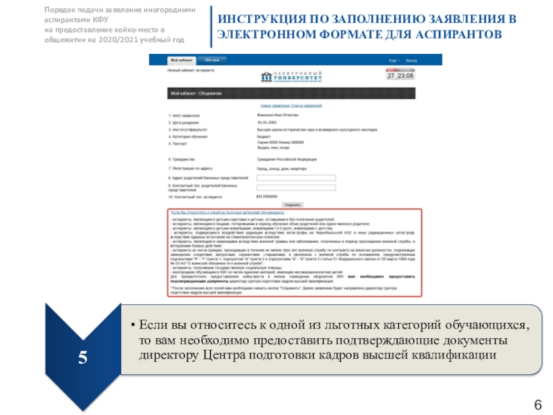 5ИНСТРУКЦИЯ ПО ЗАПОЛНЕНИЮ ЗАЯВЛЕНИЯ В ЭЛЕКТРОННОМ ФОРМАТЕ ДЛЯ АСПИРАНТОВ  Порядок подачи заявления иногородними аспирантами КФУ на