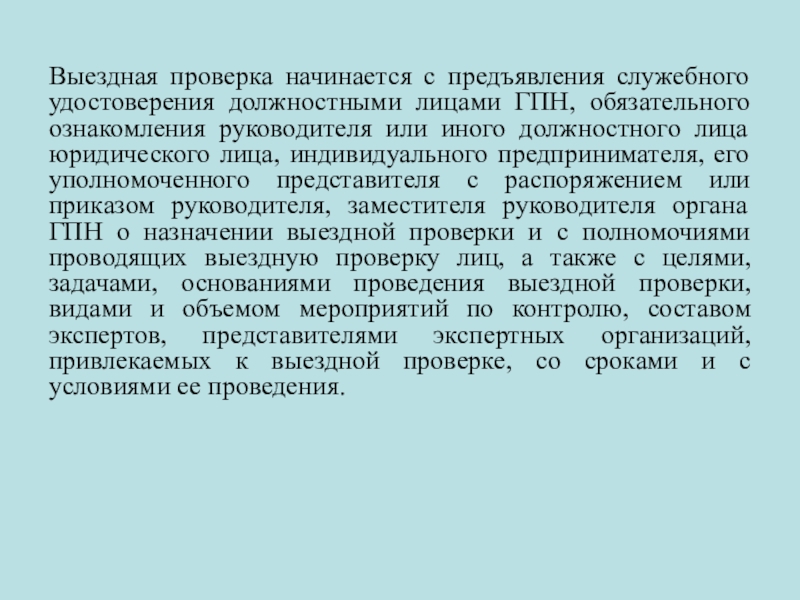 4) проводить проверку только во время исполнения служебных обязанностей, выездную проверку только при предъявлении служебных удостоверений, копии распоряжения или приказа руководителя, заместителя руководителя органа государственного контроля (надзора), органа муниципального контроля и в случае, предусмотренном частью 5 статьи 10 настоящего Федерального закона, копии документа о согласовании проведения проверки;