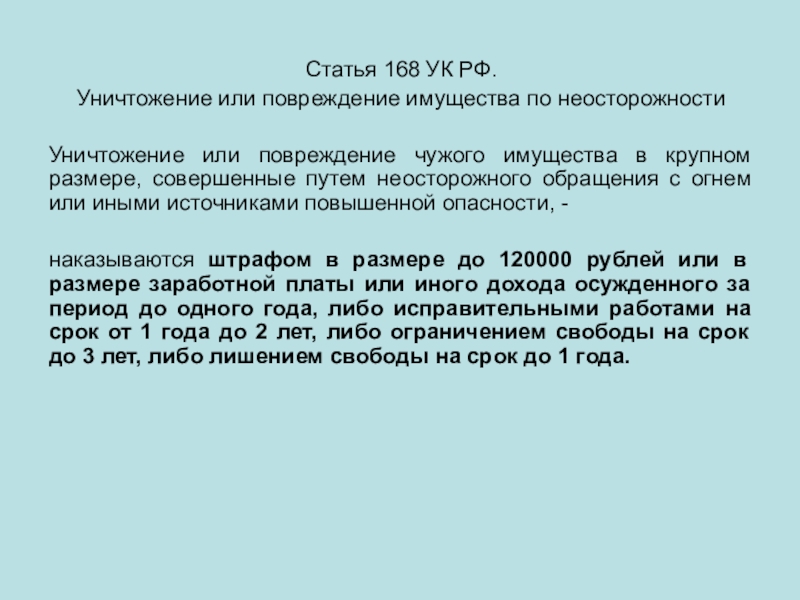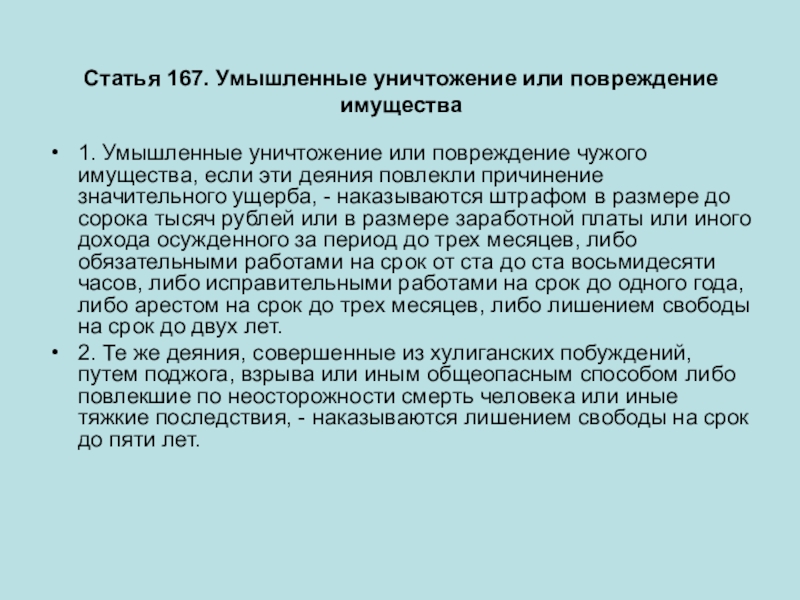 Слайд 42Статья 167. Умышленные уничтожение или повреждение имущества
