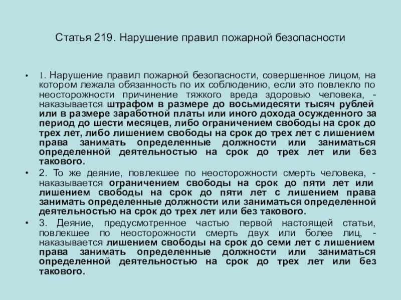 Слайд 44Статья 219. Нарушение правил пожарной безопасности