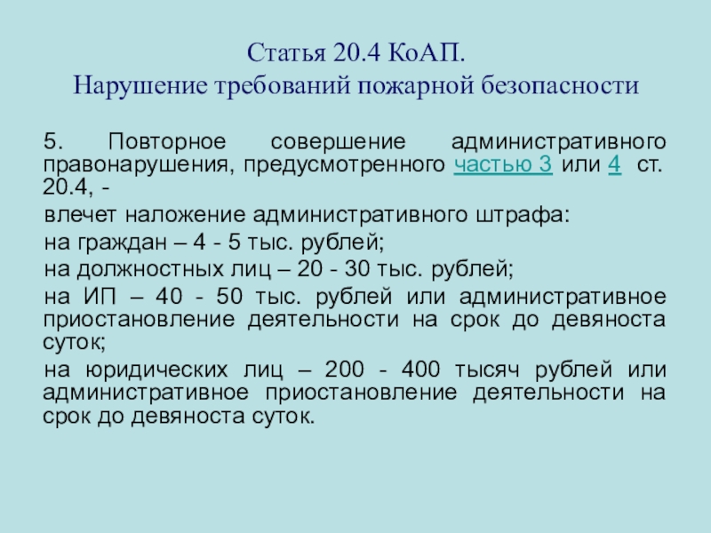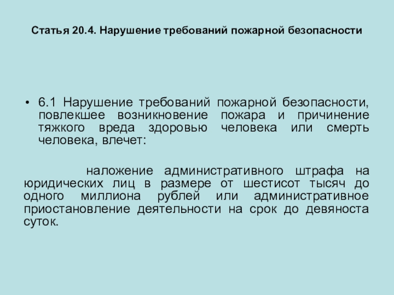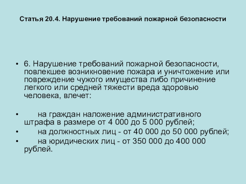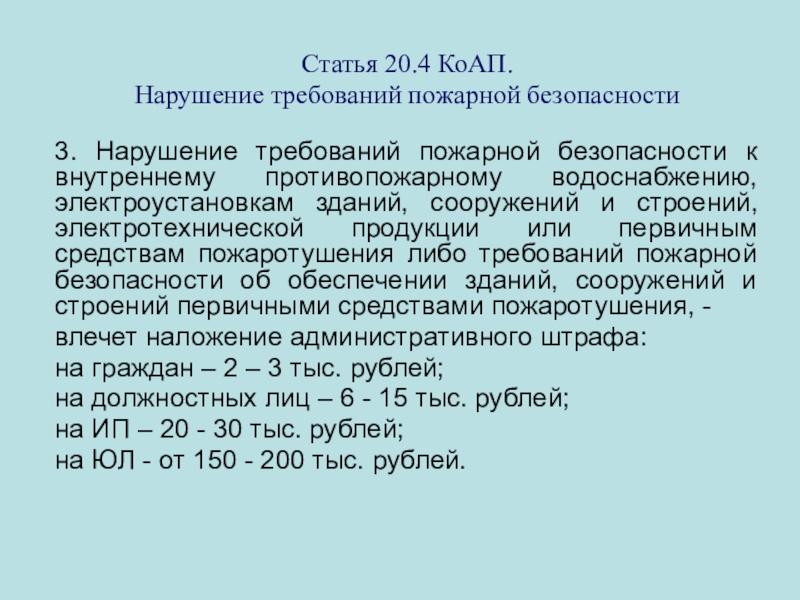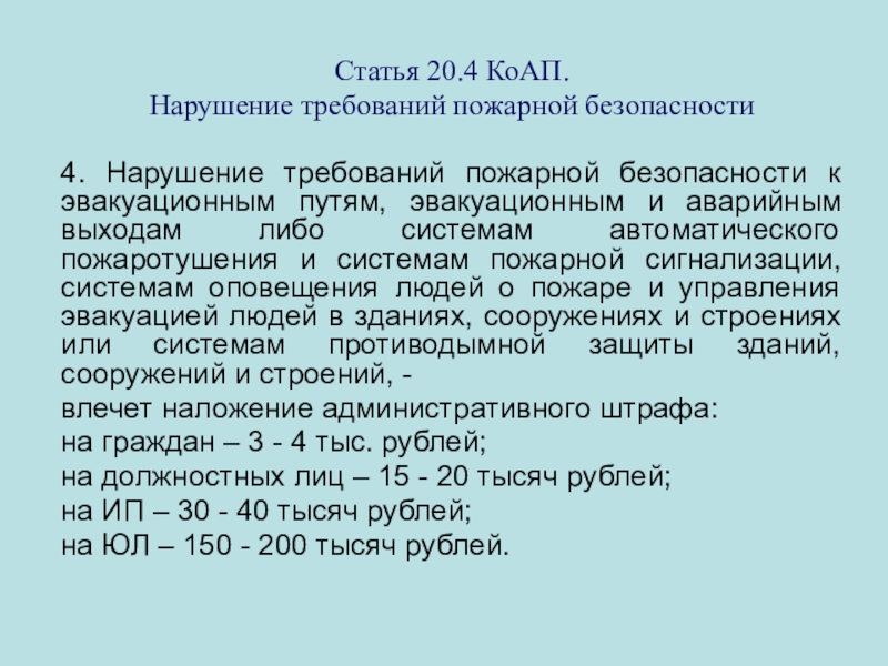 Слайд 36Статья 20.4. Нарушение требований пожарной безопасности