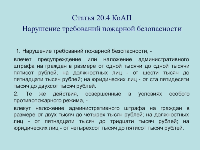 Слайд 35Статья 20.4. Нарушение требований пожарной безопасности