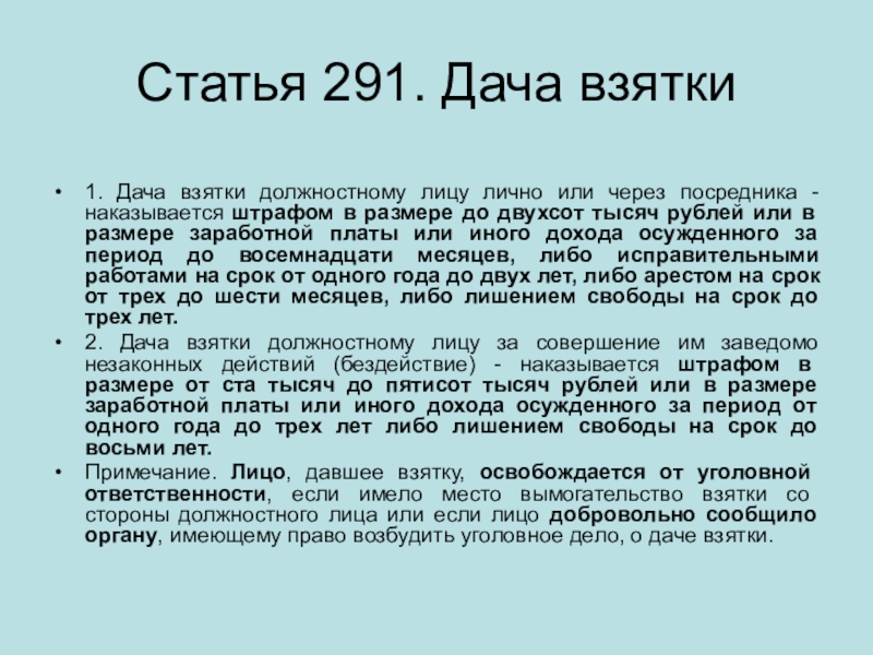 Примечание. Лицо, давшее взятку, освобождается от уголовной ответственности, если имело место вымогательство взятки со стороны должностного лица или если лицо добровольно сообщило органу, имеющему право возбудить уголовное дело, о даче взятки.