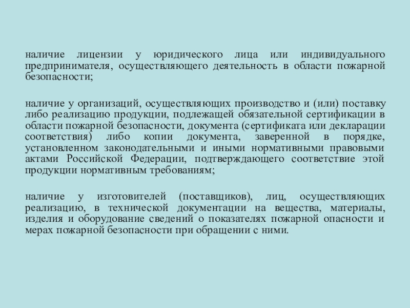 используемых при осуществлении деятельности территорий, зданий, строений, сооружений, помещений, оборудования, подобных объектов, транспортных средств, производимые и реализуемые юридическим лицом, индивидуальным предпринимателем товары (выполняемая работа, предоставляемые услуги) и принимаемые ими меры по исполнению обязательных требований пожарной безопасности.