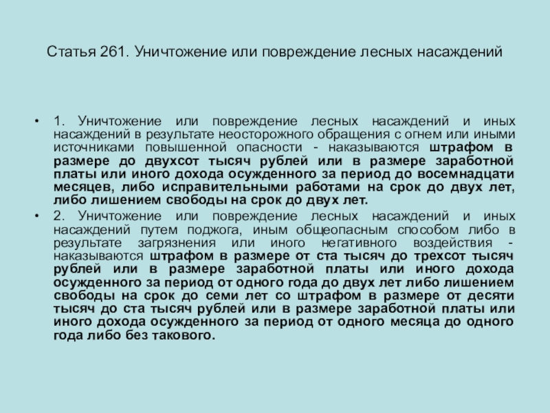 Слайд 45Статья 261. Уничтожение или повреждение лесных насаждений