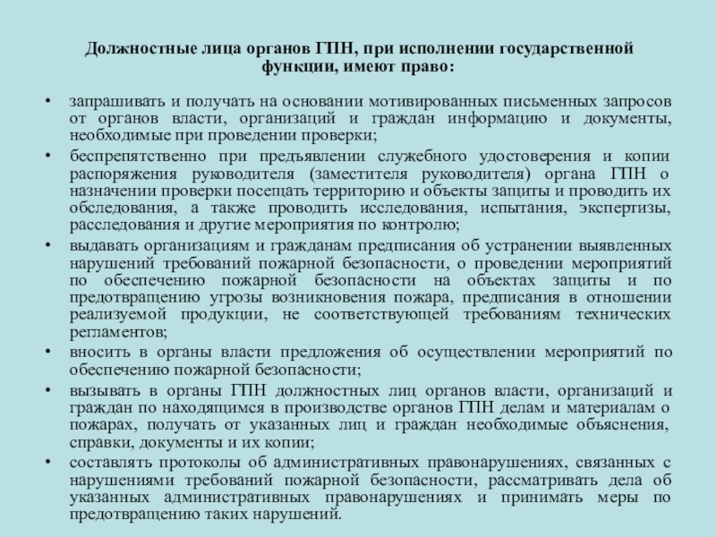 Слайд 9 Должностные лица органов ГПН, при исполнении государственной функции, имеют