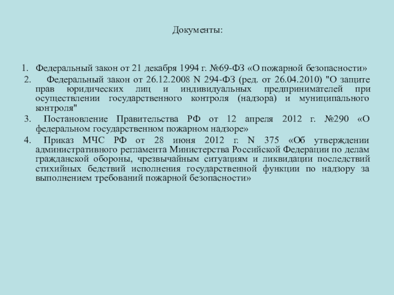 3. Постановление Правительства РФ от 12 апреля 2012 г. №290 «О федеральном государственном пожарном надзоре»