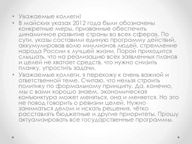 Уважаемые коллеги, я перехожу к очень важной и ответственной теме. Считаю, что нельзя строить политику по формальному принципу. Да, конечно, мы с вами хорошо знаем, экономическая конъюнктура может меняться, она и меняется. Но это не повод говорить о ревизии целей. Нужно заниматься делом и искать решения, чётко расставлять бюджетные и другие приоритеты. Прошу актуализировать все государственные программы.