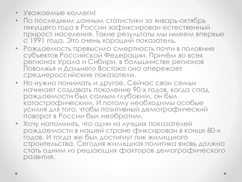 Хочу напомнить, что один из лучших показателей рождаемости в нашей стране фиксирован в конце 80-х годов. И тогда же был достигнут пик жилищного строительства. Сегодня жилищная политика вновь должна стать одним из решающих факторов демографического развития.