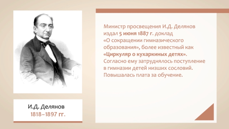 Слайд 18Министр просвещения И.Д. Делянов издал 5 июня 1887 г. доклад