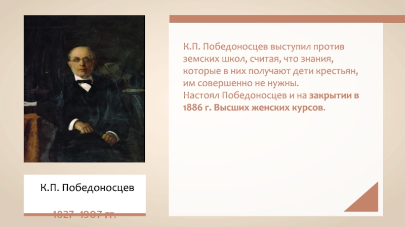 Слайд 19К.П. Победоносцев выступил против земских школ, считая, что знания, которые