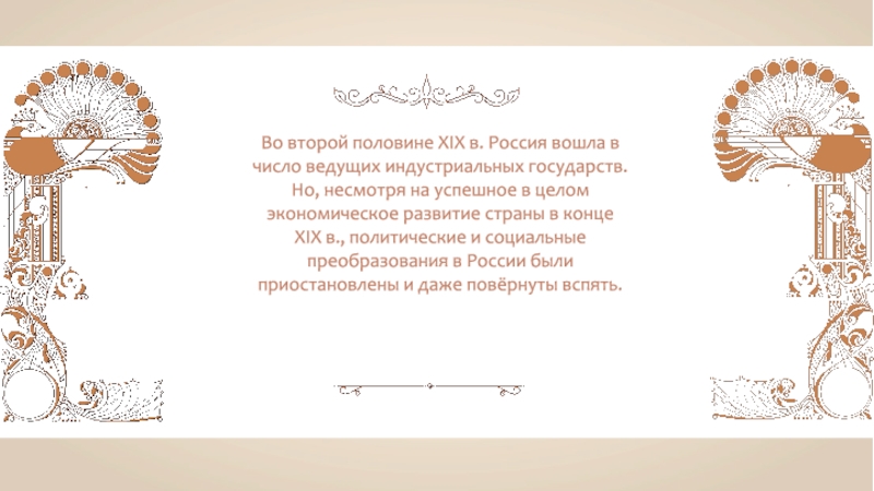страны в конце XIX в., политические и социальные преобразования в России были приостановлены и даже повёрнуты вспять.