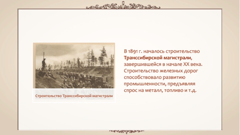 Слайд 23В 1891 г. началось строительство Транссибирской магистрали, завершившейся в начале