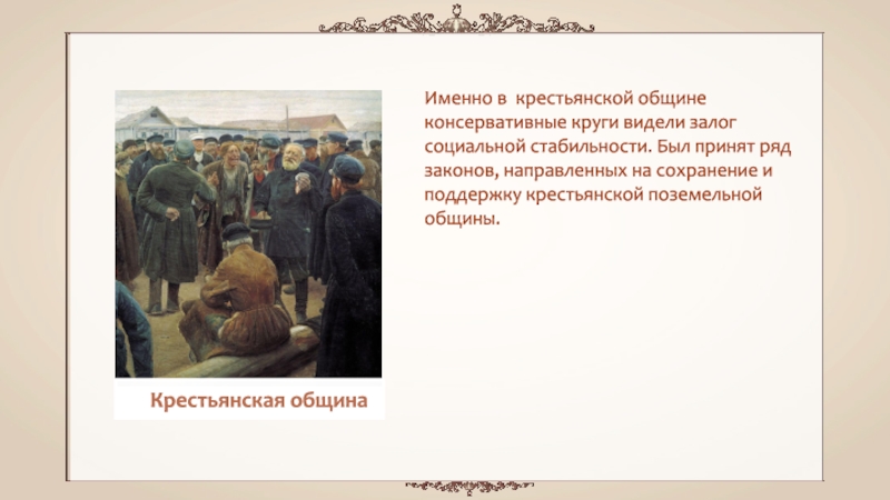 Слайд 9Именно в крестьянской общине консервативные круги видели залог социальной стабильности.