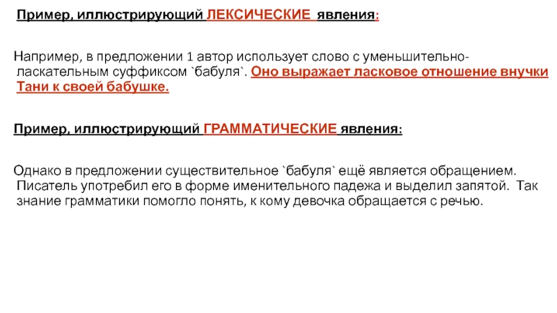 В предложении 1 автор использует слово с уменьшительно-ласкательным суффиксом `бабуля` (лексическое явление названо). Оно выражает ласковое отношение внучки Тани к своей бабушке (объяснена роль слова в тексте). Однако в предложении существительное `бабуля` ещё является обращением (названо грамматическое явление). Писатель употребил его в форме именительного падежа и выделил запятой (прокомментировано грамматическое явление и названы основные грамматические признаки обращений). Так знание грамматики помогло понять, к кому девочка обращается с речью (названа роль речевой единицы в тексте).