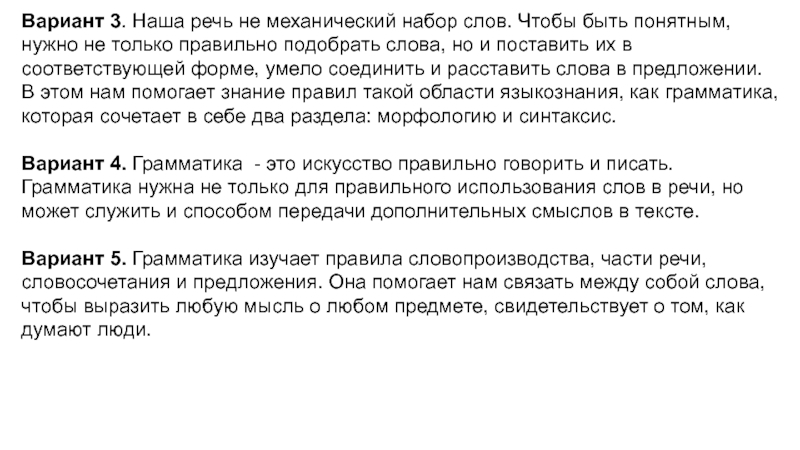 Вариант 5. Грамматика изучает правила словопроизводства, части речи, словосочетания и предложения. Она помогает нам связать между собой слова, чтобы выразить любую мысль о любом предмете, свидетельствует о том, как думают люди.