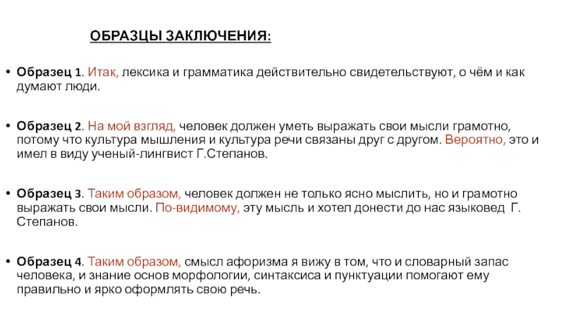 Слайд 19ОБРАЗЦЫ ЗАКЛЮЧЕНИЯ: