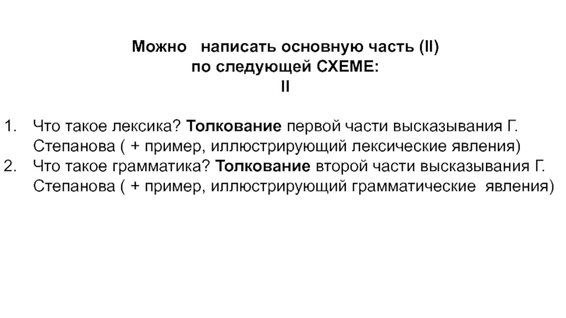• 2 абзац - толкование первой части высказывания + пример, иллюстрирующий лексические явления, (II)