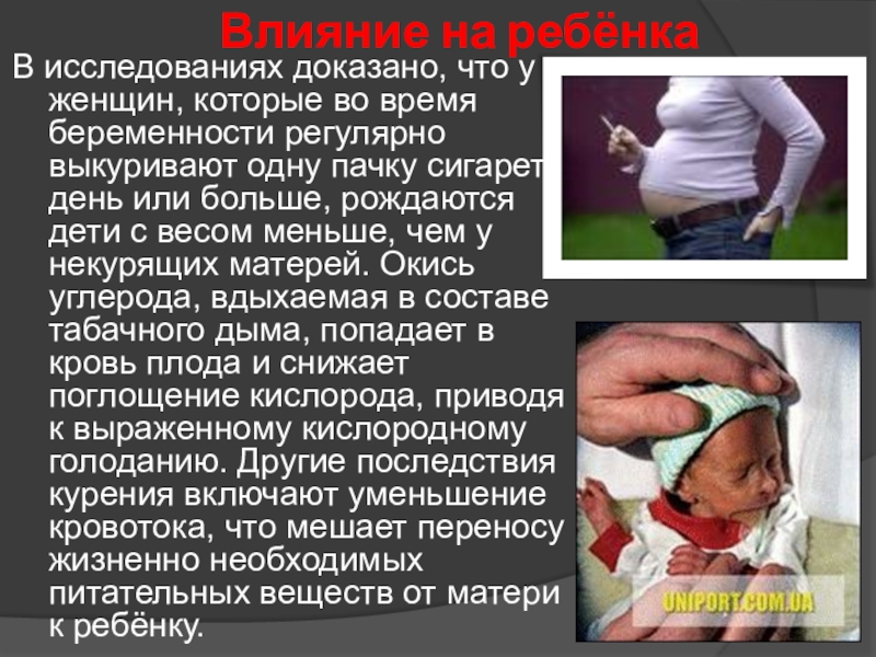 больше, рождаются дети с весом меньше, чем у некурящих матерей. Окись углерода, вдыхаемая в составе табачного дыма, попадает в кровь плода и снижает поглощение кислорода, приводя к выраженному кислородному голоданию. Другие последствия курения включают уменьшение кровотока, что мешает переносу жизненно необходимых питательных веществ от матери к ребёнку.