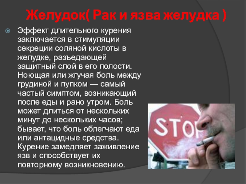 никотин, действуя через кровь, и попадает в желудок со слюной, вызывает повышение кислотности желудочного сока почти в 2 – 2,5 раза.