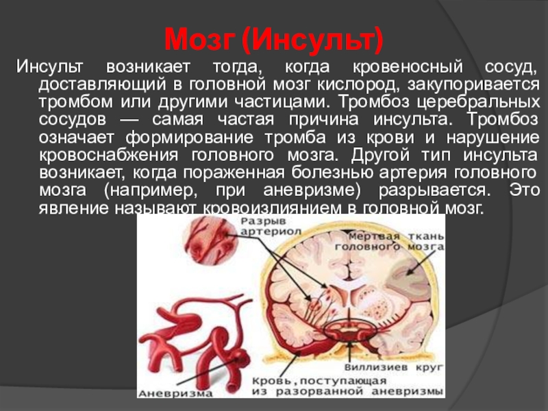 сосудов — самая частая причина инсульта. Тромбоз означает формирование тромба из крови и нарушение кровоснабжения головного мозга. Другой тип инсульта возникает, когда пораженная болезнью артерия головного мозга (например, при аневризме) разрывается. Это явление называют кровоизлиянием в головной мозг.