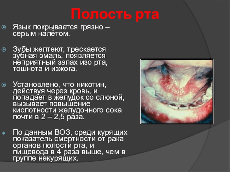 По данным ВОЗ, среди курящих показатель смертности от рака органов полости рта, и пищевода в 4 раза выше, чем в группе некурящих.