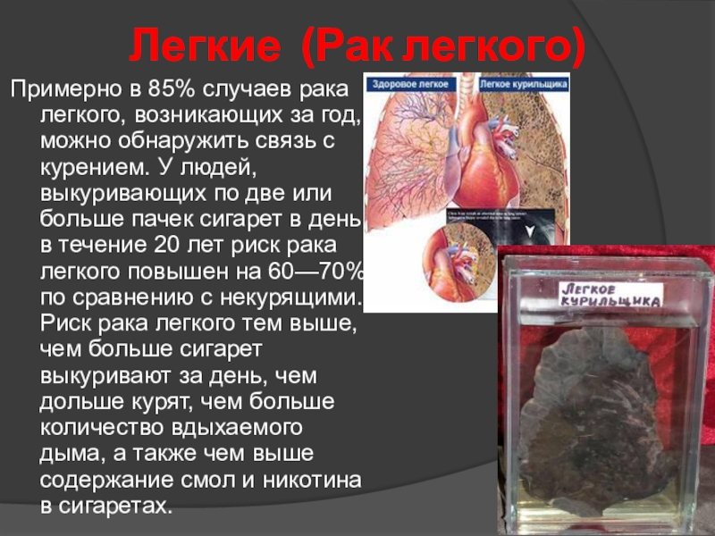 две или больше пачек сигарет в день в течение 20 лет риск рака легкого повышен на 60—70% по сравнению с некурящими. Риск рака легкого тем выше, чем больше сигарет выкуривают за день, чем дольше курят, чем больше количество вдыхаемого дыма, а также чем выше содержание смол и никотина в сигаретах.