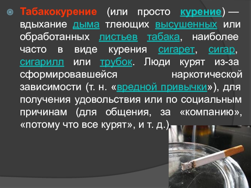 Слайд 2Табакокурение (или просто курение) — вдыхание дыма тлеющих высушенных или обработанных
